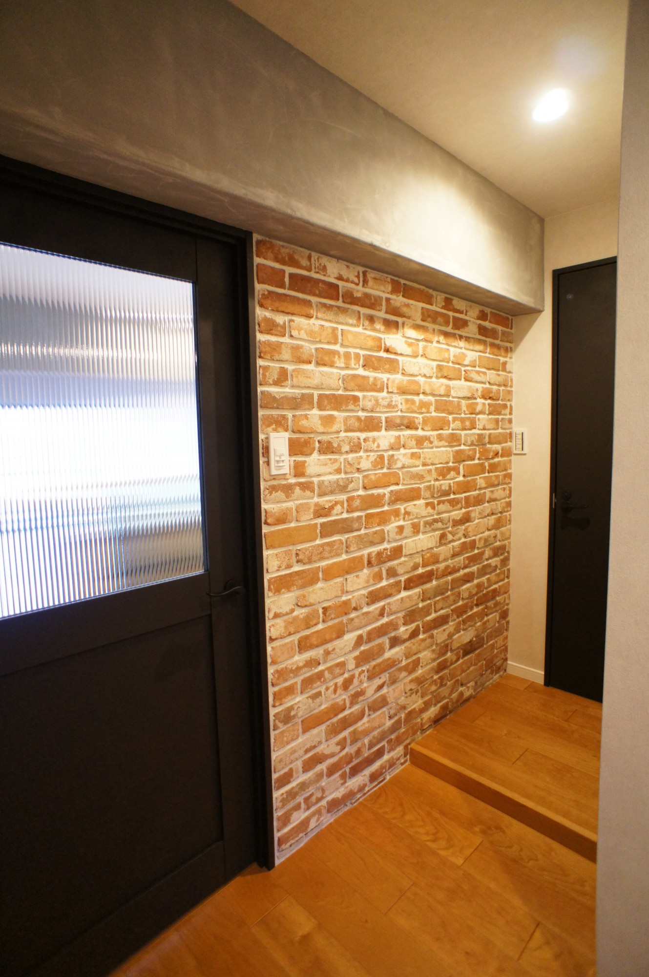 玄関を開けるとリビングまで廊下壁に貼られたヴィンテージレンガが重厚なブルックリンNYスタイルを感じさせます。