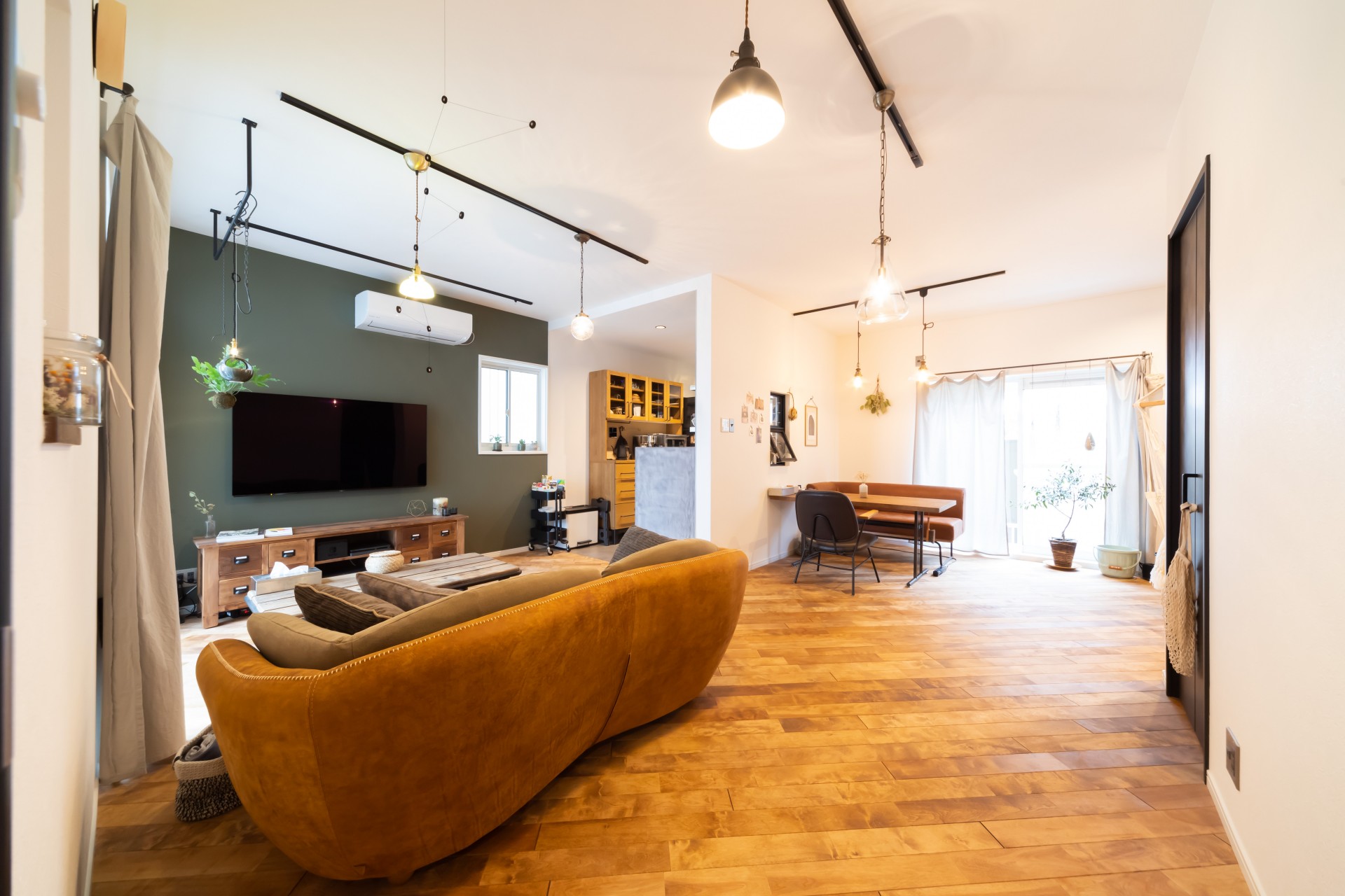 無垢のフローリングを斜め張りにして広がりが出したり、ハンギングプランターを吊るためのアイアンバーを付けたりはご主人様のご要望です。