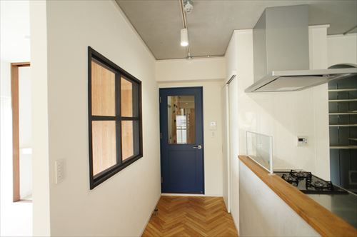 キッチンに対面してる壁には室内窓があるので和室からの様子や奥にある窓からの風景も眺めれるので開放的です。
