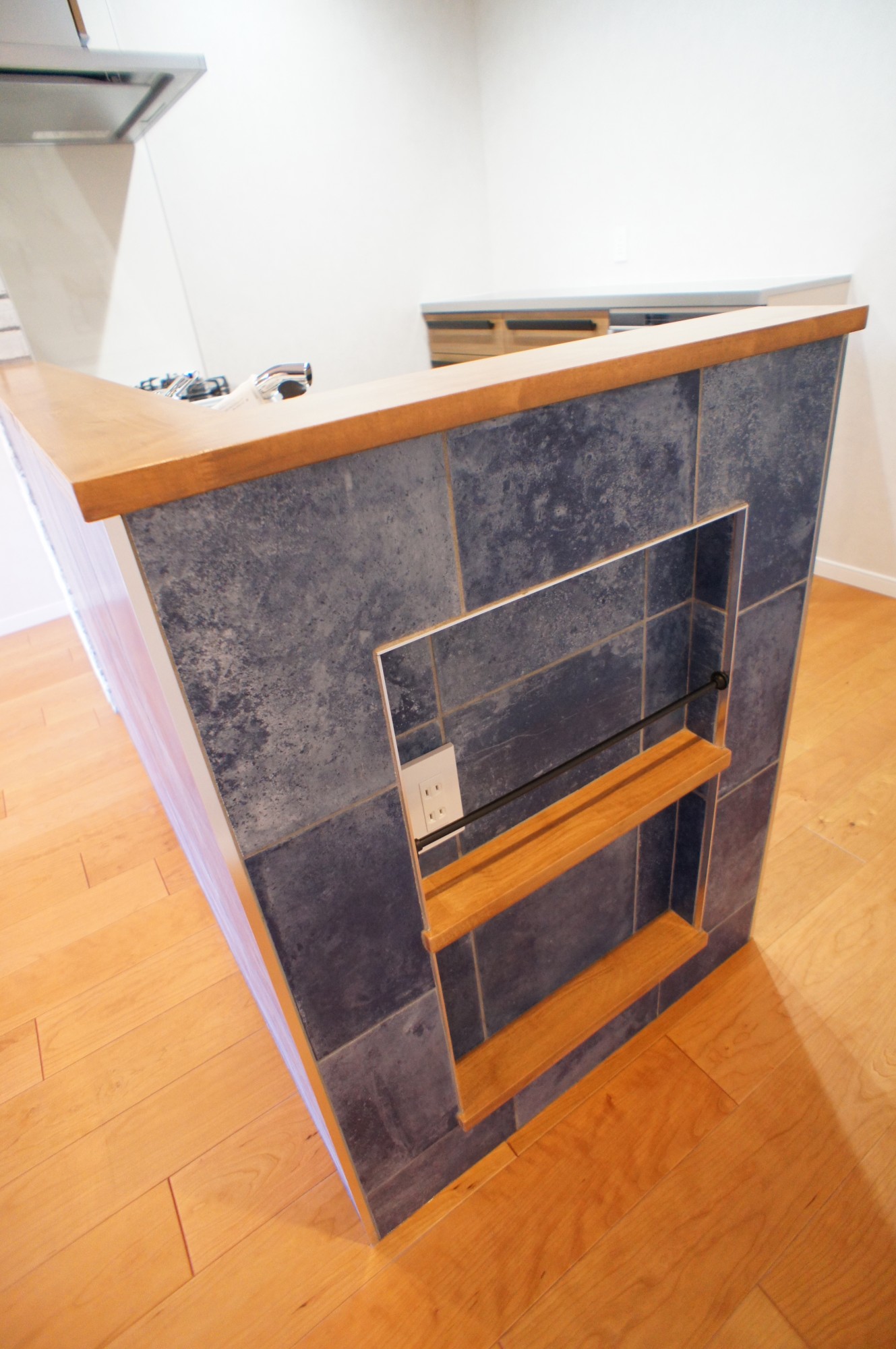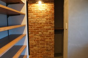 玄関を開けるとリビングまで廊下壁に貼られたヴィンテージレンガが重厚なブルックリンNYスタイルを感じさせます。