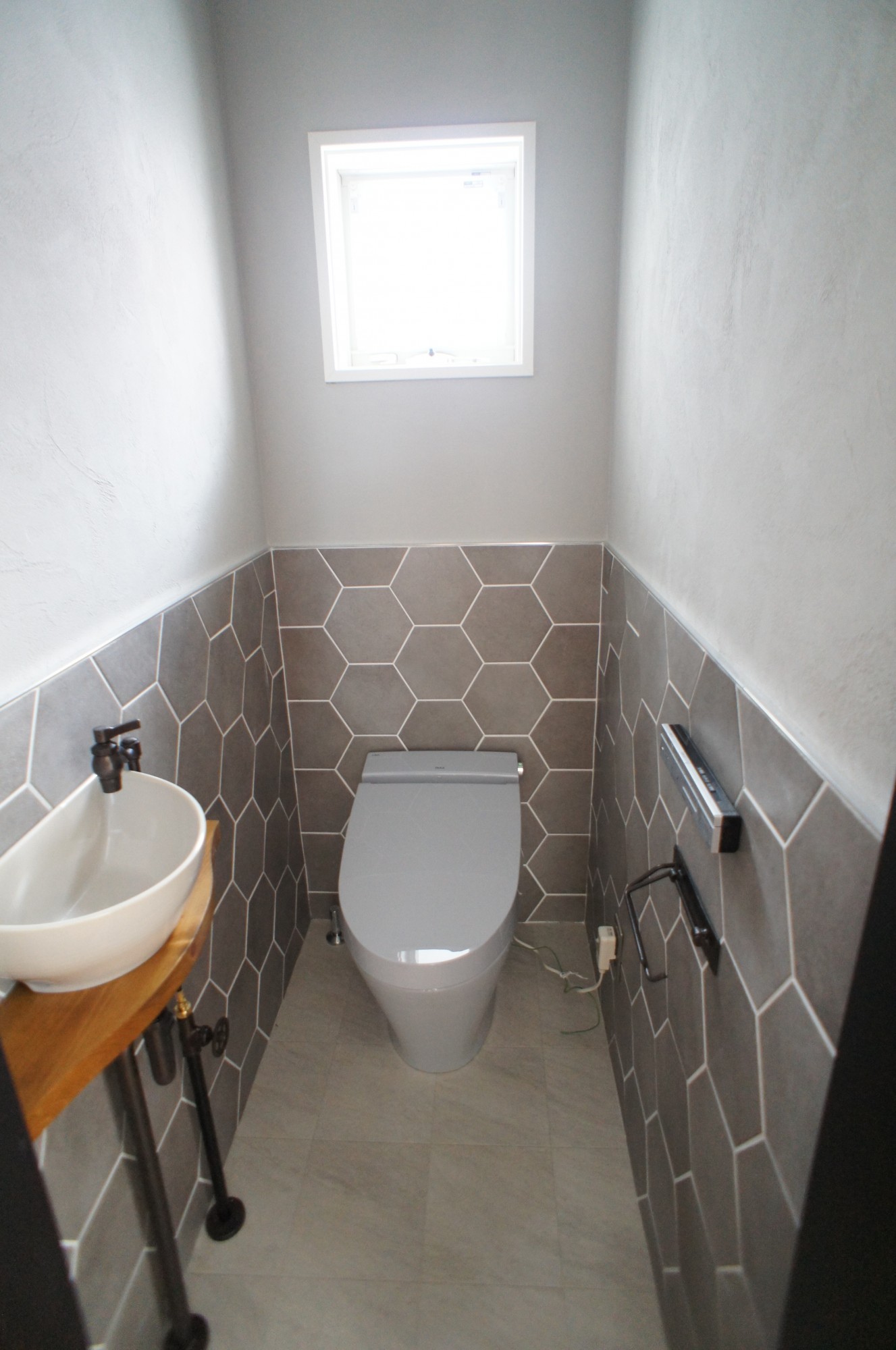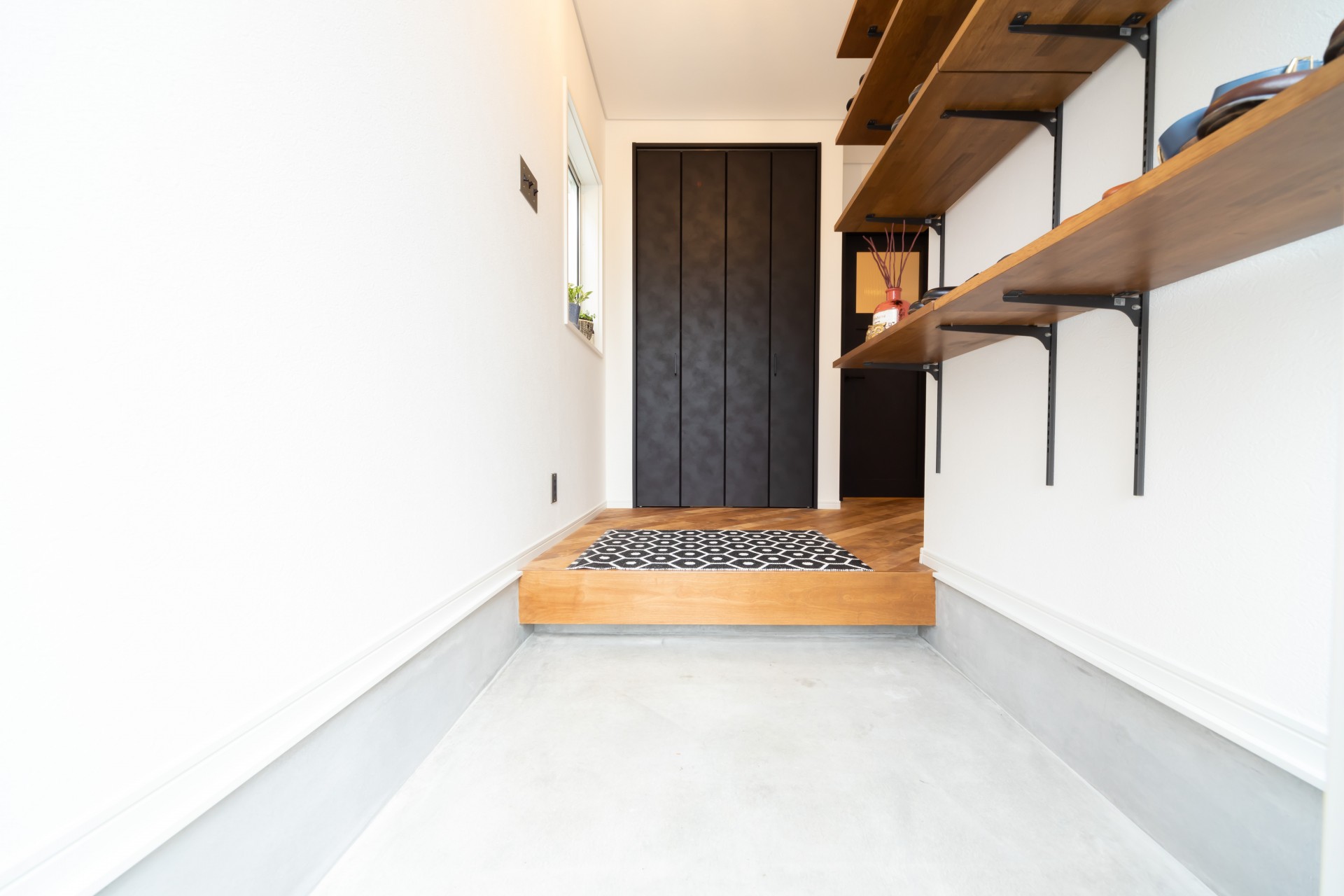 無垢のフローリングを斜め張りにして広がりが出したり、ハンギングプランターを吊るためのアイアンバーを付けたりはご主人様のご要望です。