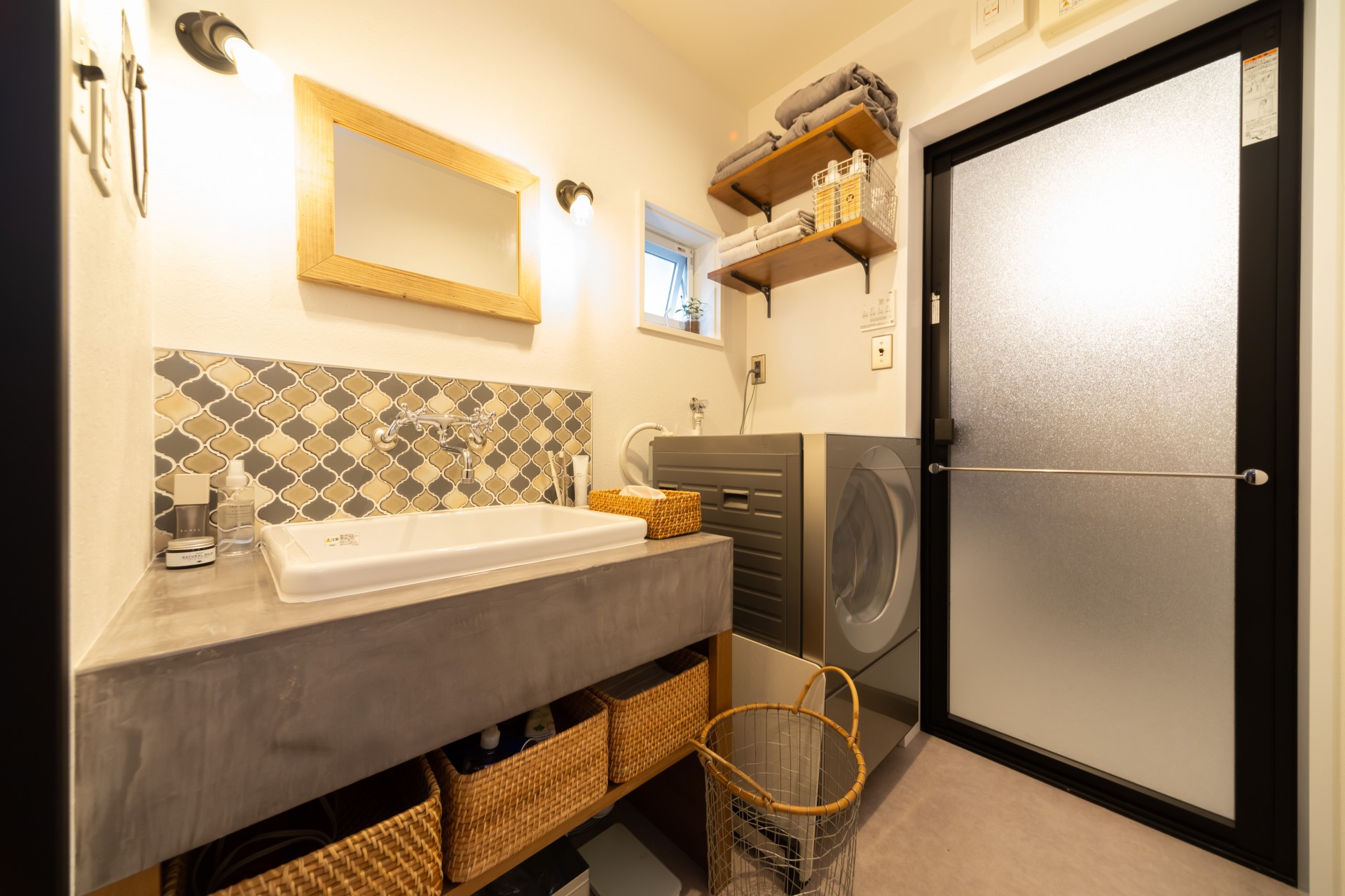 洗面台の上に貼ったモロッコタイルは数種類の色をオーダーでミックスし、洗面台は水回りに強い樹脂系のモルタルカラーの左官材で仕上げています。