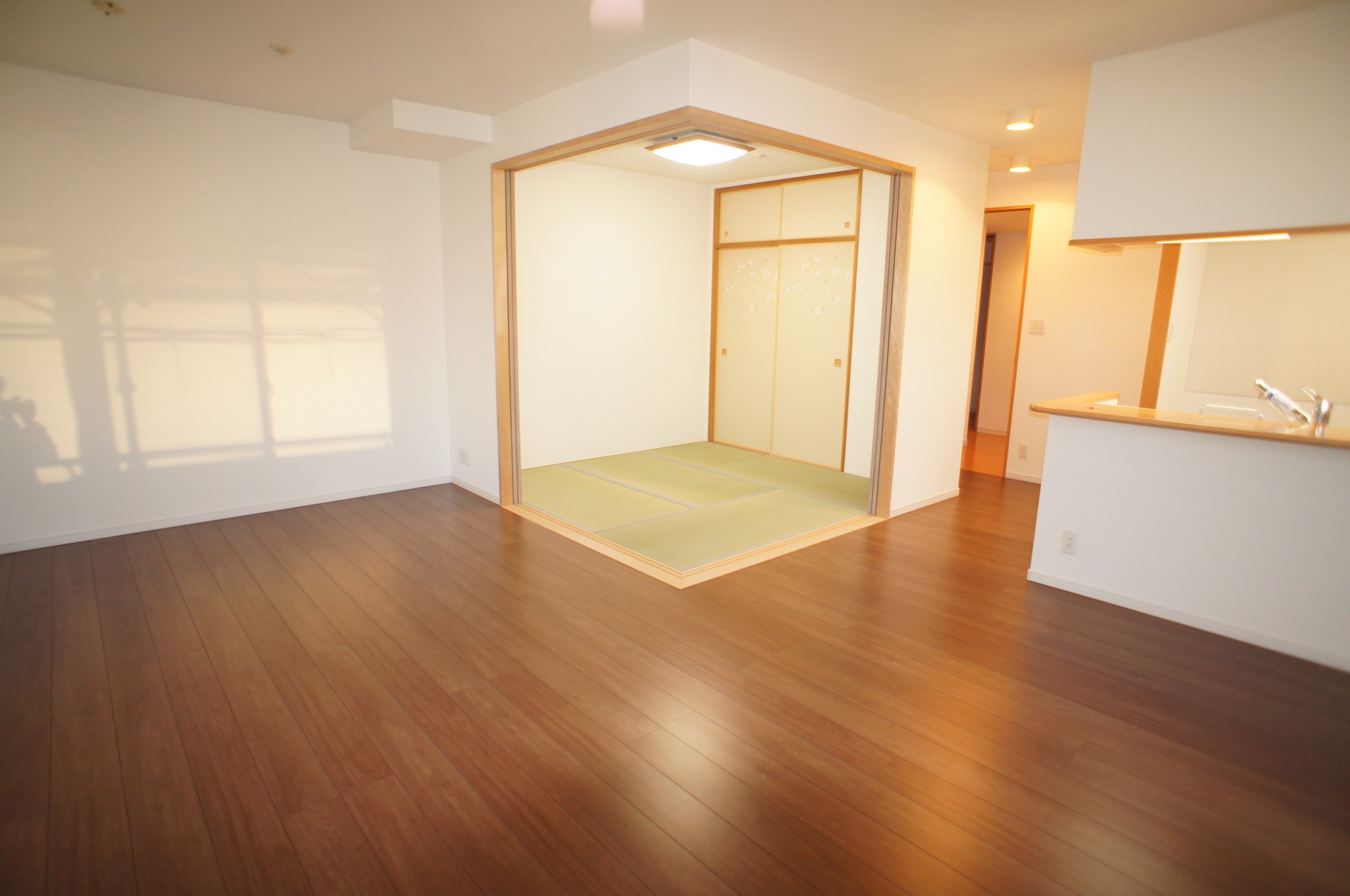 4LDKの間取りのお部屋でしたが、リビングをもっと有効に広く使えるようにリビング横の洋室をリビングに取り込み和室も開放できるように壁を取っ払い扉を新しくし最大25畳になる広いリビングは対面キッチンからリビング全体を見渡せるようになり使いやすくなりました。