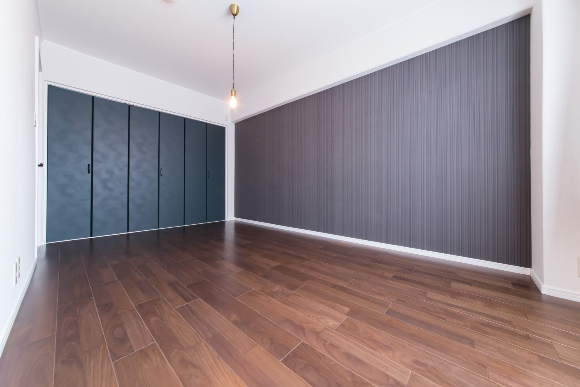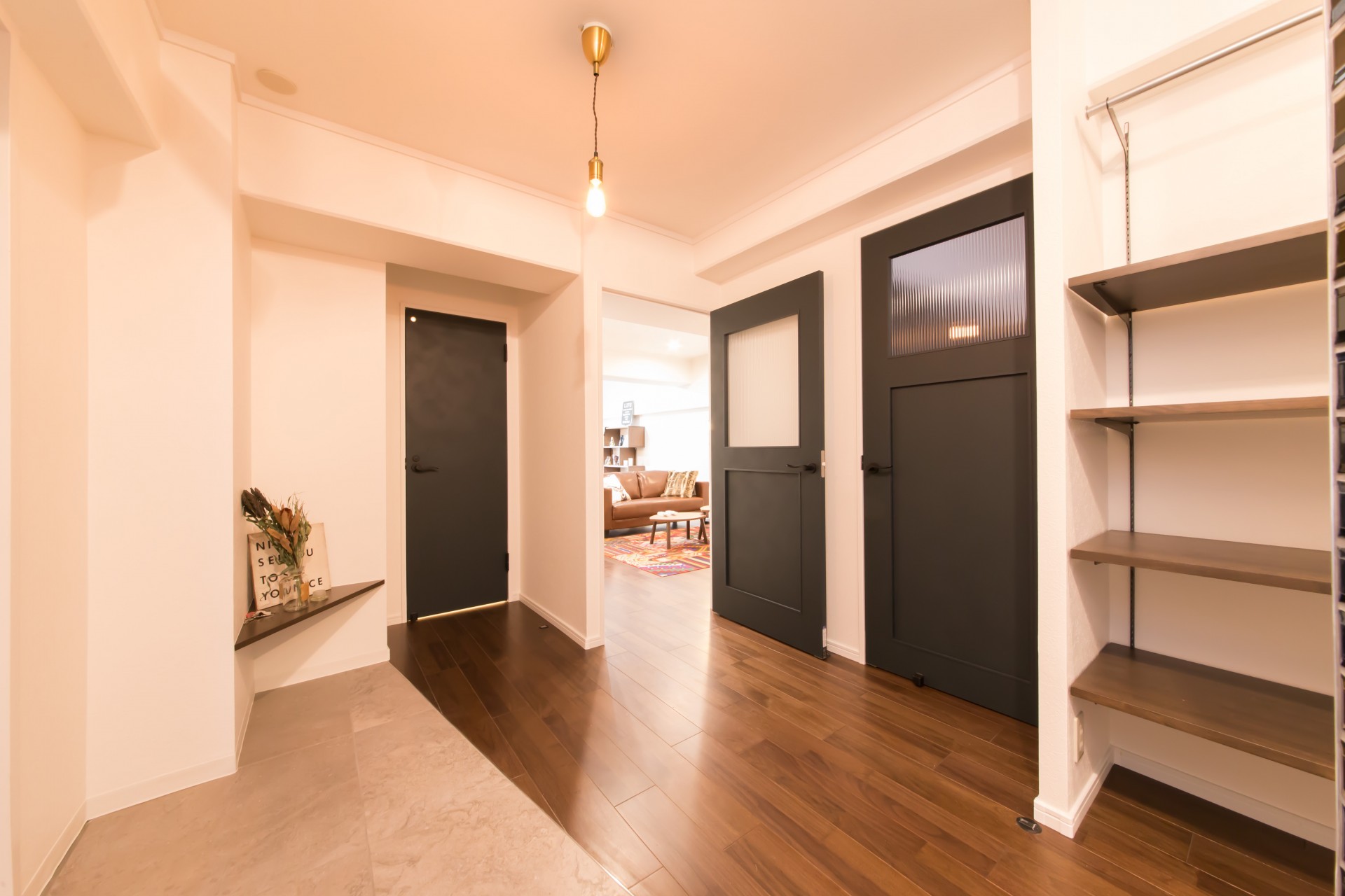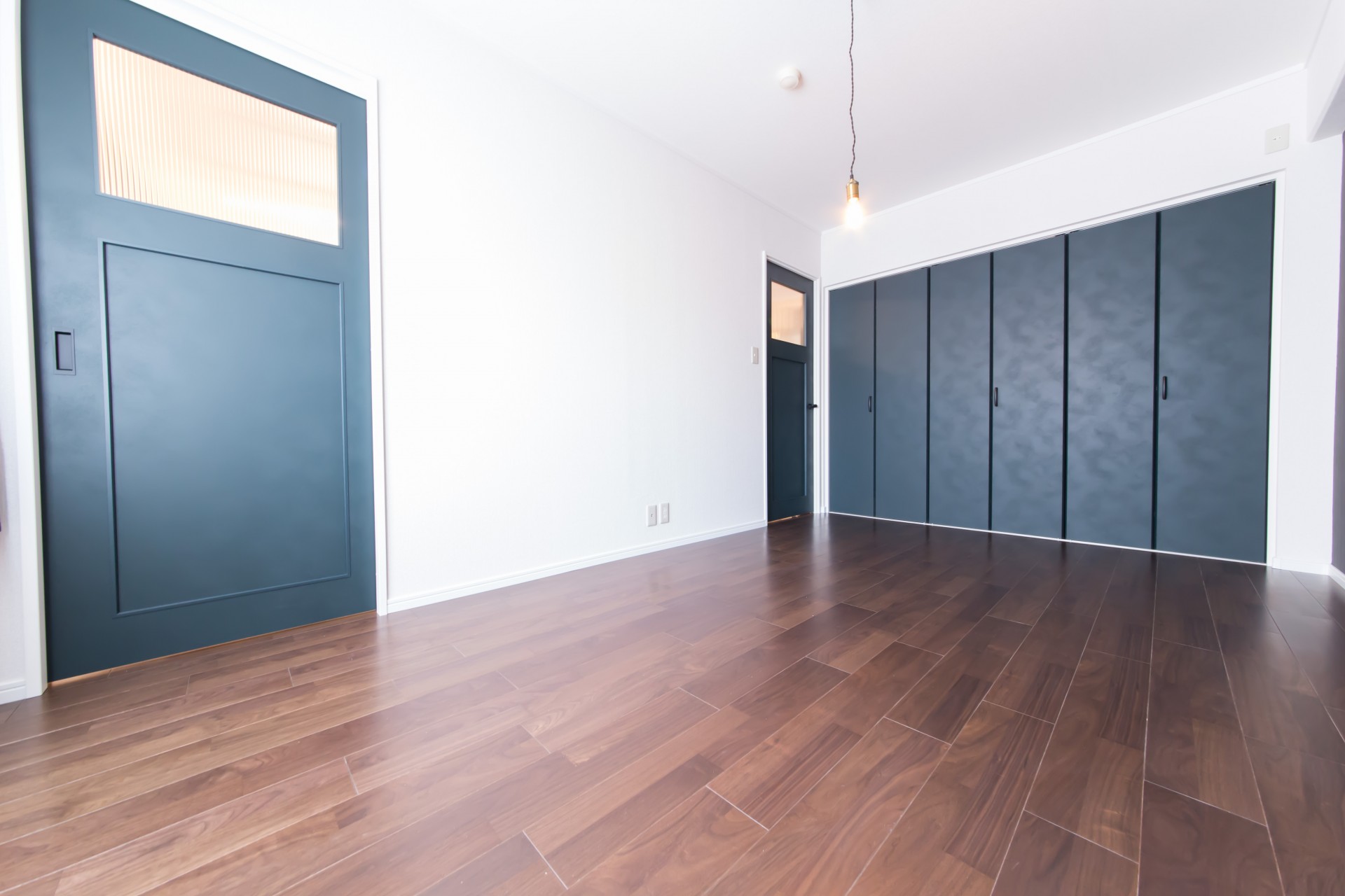ブラックウォルナットの落ち着いた雰囲気の床とヴィンテージライクなダークグリーンの建具がアクセントになったTHE男の隠れ家な遊び心がある内装に仕上がりました。