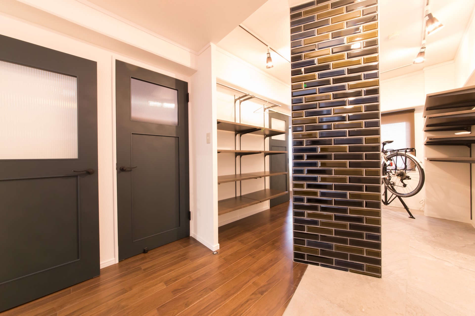 一番のポイントはレトロなタイル壁がアクセントになった大きな土間。