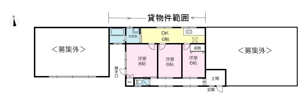 | 間取り | 3DK( 洋室 6・6・8 帖 / DK 6 帖 ) | ||