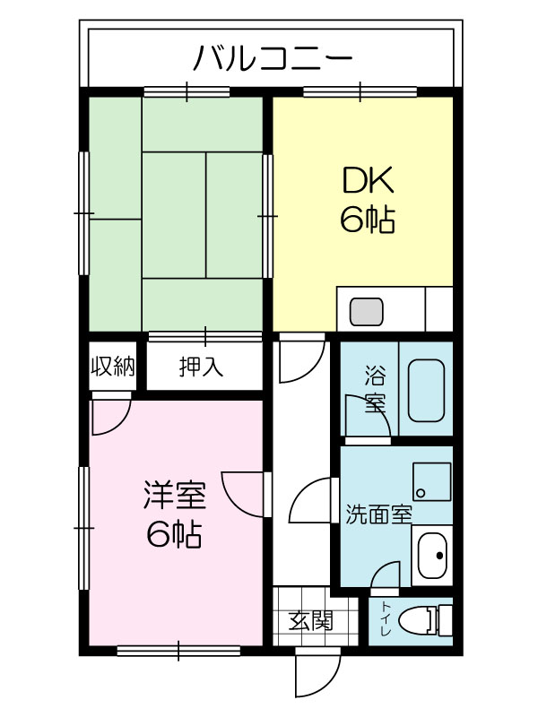 間取り 2DK( 洋室 6 帖 / 和室 6 帖 / DK 6 帖 )