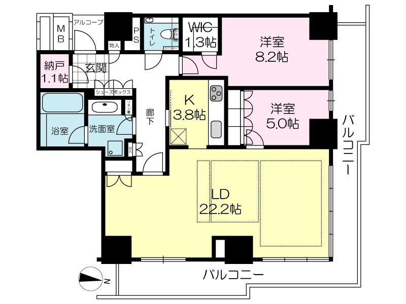 間取り | 2LDK+S( 洋室 5・8.2 帖 / LD 22.2 帖 / K 3.8 帖 / 納戸 1 帖 ) | ||