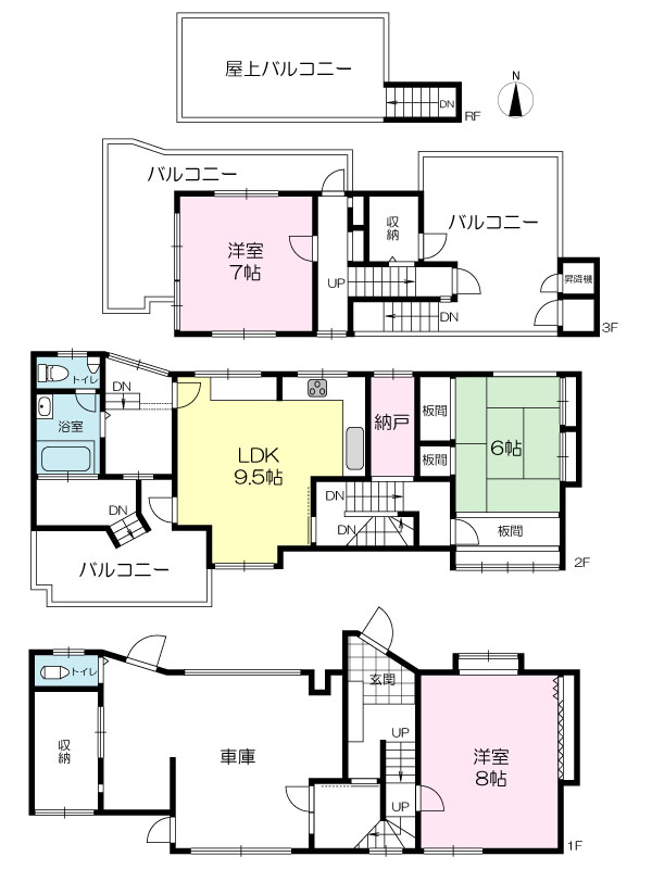 間取り 3LDK+S( 洋室 8・7 帖 / 和室 6 帖 / LDK 9.5 帖 / 納戸 2 帖 )