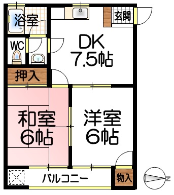 間取り 2DK( 洋室 6 帖 / 和室 6 帖 / DK 7 帖 )