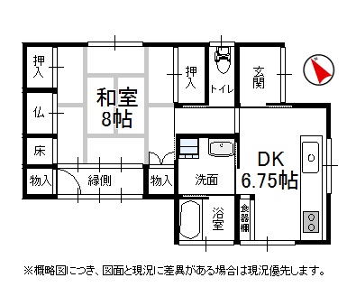 | 間取り | 1DK( 和室 8 帖 / DK 6.75 帖 ) | ||