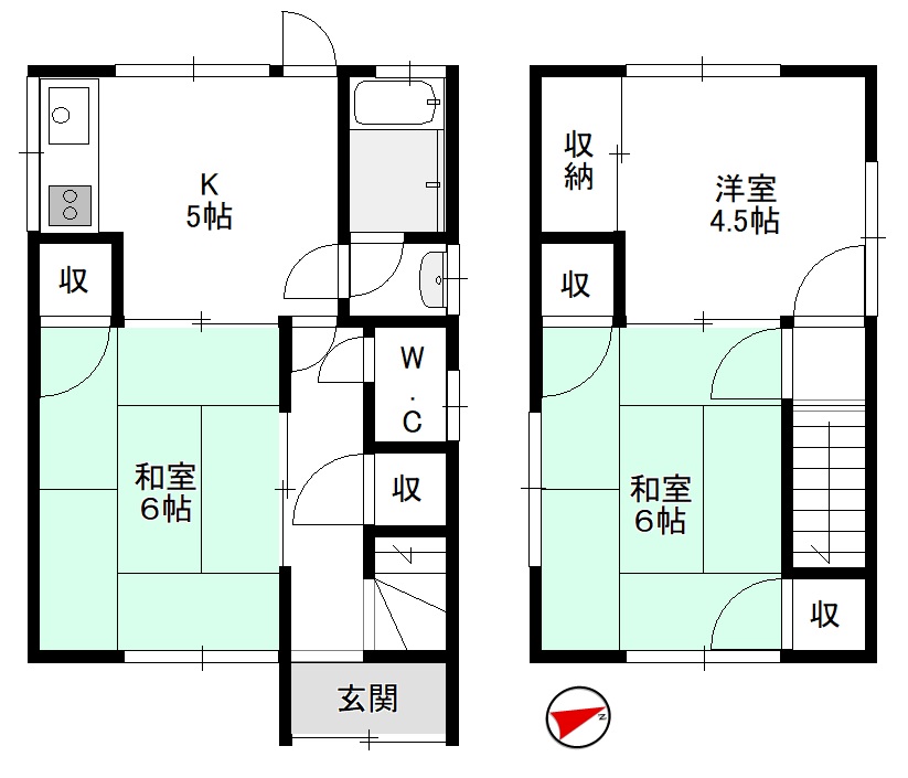 間取り 3K( 洋室 4.5 帖 / 和室 6・6 帖 / K 5 帖 )