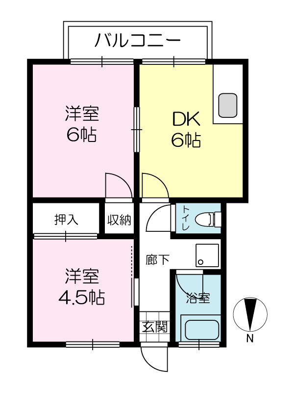 間取り 2DK( 洋室 6・4.5 帖 / DK 6 帖 )