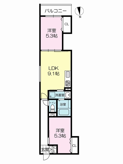 間取り 2LDK( 洋室 5.3・5.3 帖 / LDK 9.1 帖 )