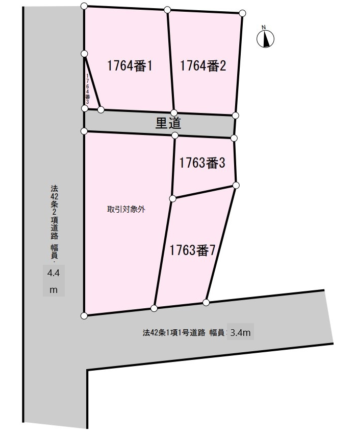| 接道状況 | [ 西 / 道路幅員 約3.4m ] [ 南 / 道路幅員 約4.4m ] |