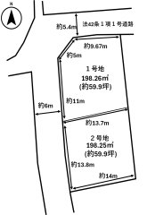 ※境界ブロックについては買主負担です。 ①1号地 198.26㎡(約59.9坪)¥2100万 ②2号地 198.25㎡(約59.9坪)¥2180万 |