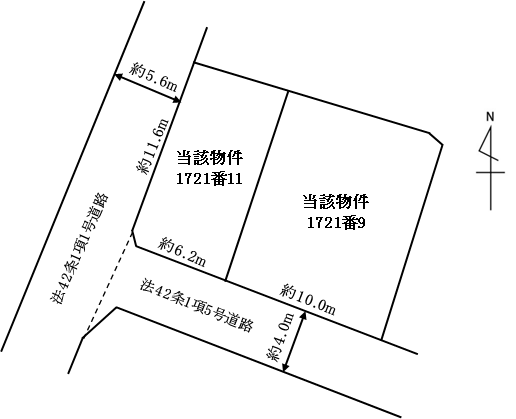 接道状況 | [ 西 / 道路幅員 約5.6m 接道幅 公道 約11.6 m ] [ 南 / 道路幅員 約4m 接道幅 私道 約16.2 m ] |