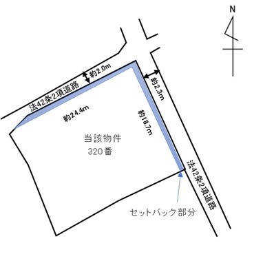 | 接道状況 | [ 北東 / 道路幅員 約2.3m 接道幅 公道 ] [ 北 / 道路幅員 約2m 接道幅 公道 ] |