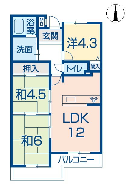 間取り 3LDK( 洋室 4.3 帖 / 和室 6・4.5 帖 / LDK 12 帖 )