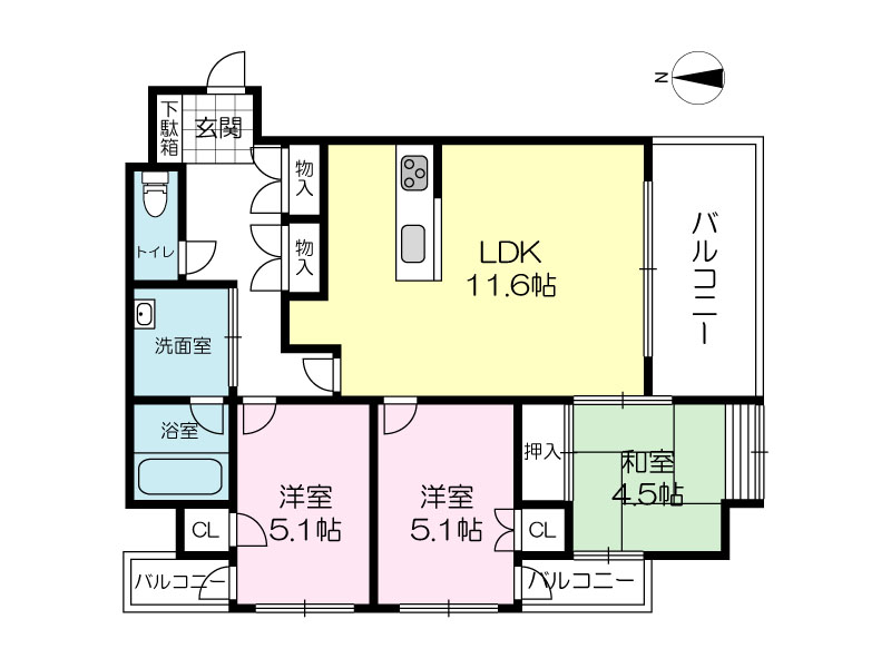 間取り 3LDK( 洋室 5.1・5.1 帖 / 和室 4.5 帖 / LDK 11.6 帖 )