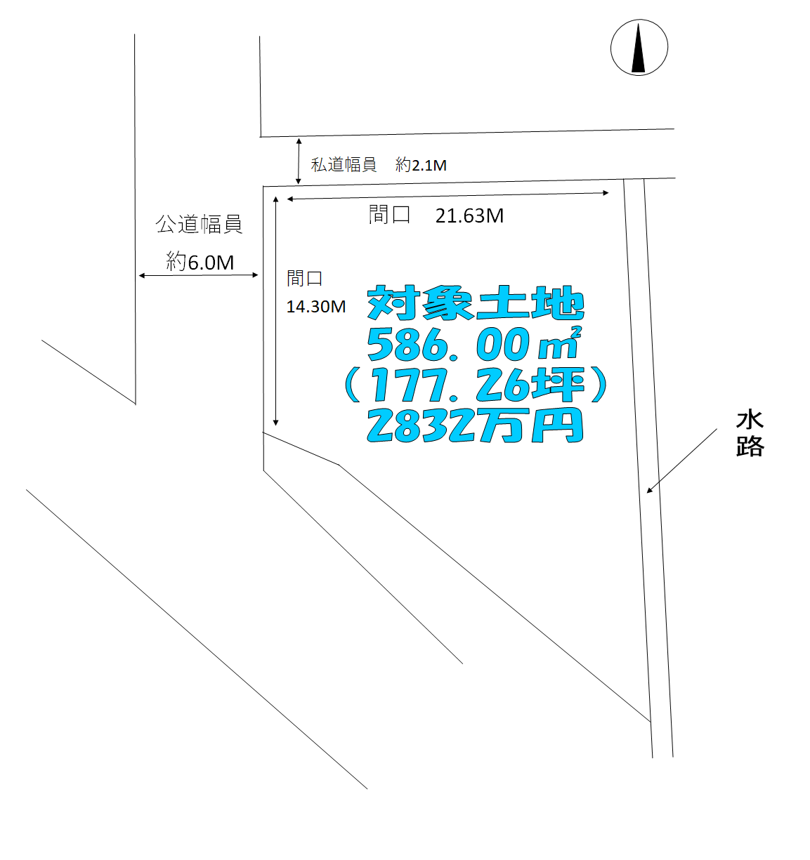 | 接道状況 | [ 西 / 道路幅員 約6m 接道幅 公道 約14.3 m ] [ 北 / 道路幅員 約2.1m 接道幅 公道 約21.6 m ] |