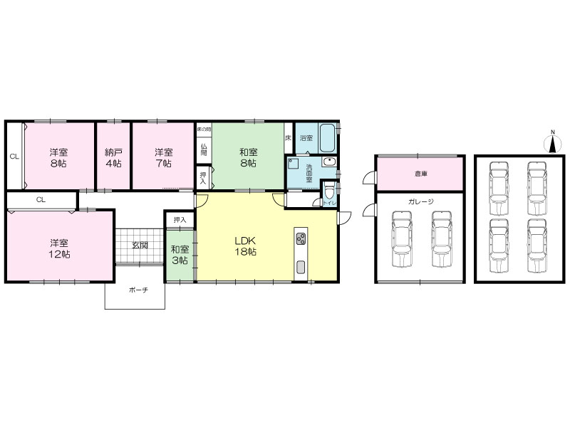 | 間取り | 4LDK+S( 洋室 7・8・12 帖 / 和室 8 帖 / LDK 18 帖 / 納戸 4 帖 ) | ||