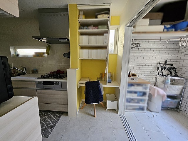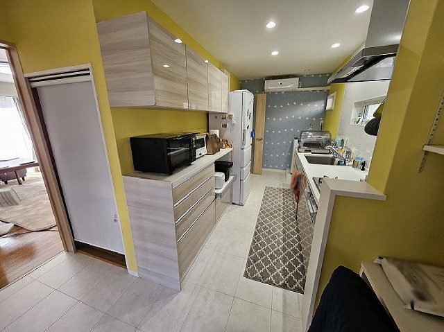 キッチンはシステムキッチンで、壁紙が一部黄色や柄が入っており明るい雰囲気のキッチンです!