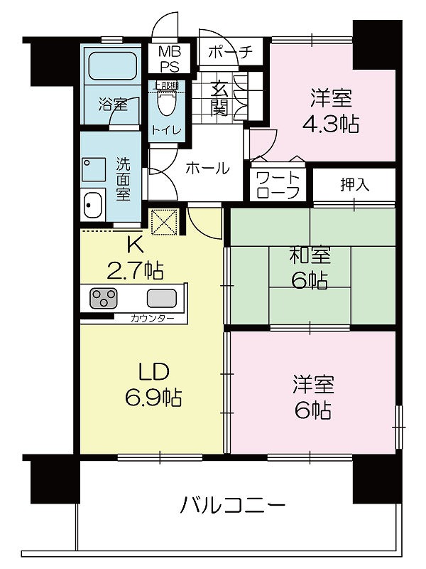| 間取り | 3LDK( 洋室 6・4.3 帖 / 和室 6 帖 / LDK 9.6 帖 ) | ||