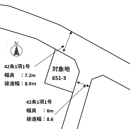 | 接道状況 | [ 東 / 道路幅員 約6m 接道幅 公道 約8.6 m ] [ 北 / 道路幅員 約7.2m 接道幅 公道 約8.9 m ] |