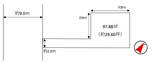 | 接道状況 | [ 南西 / 道路幅員 約9m 接道幅 公道 約2 m ] |