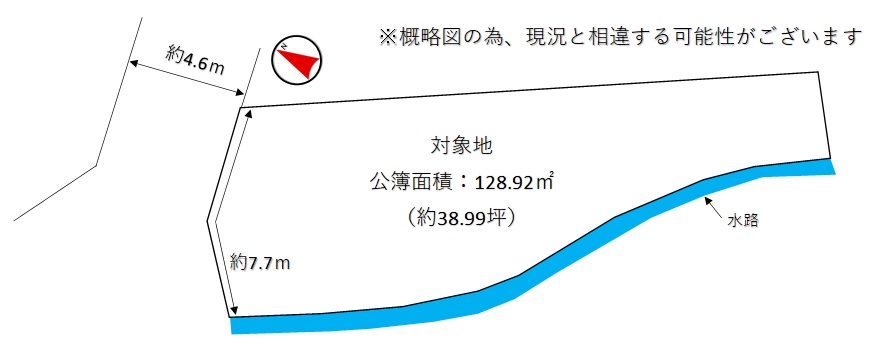 | 接道状況 | [ 北 / 道路幅員 約4.6m 接道幅 公道 約7.7 m ] |