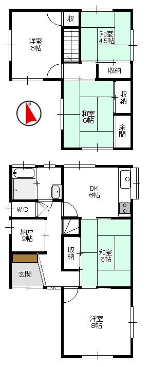 | 間取り | 5DK+S( 洋室 8・6 帖 / 和室 6・6・4.5 帖 / DK 6 帖 / 納戸 2 帖 ) | ||