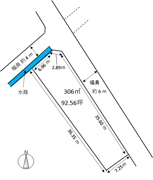 接道状況 | [ 東 / 道路幅員 約6m 接道幅 公道 約35.6 m ] [ 北 / 道路幅員 約4.1m 接道幅 公道 約9.85 m ] |