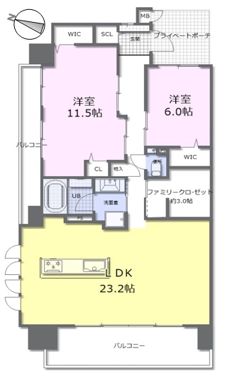 間取り 2LDK( 洋室 11.5・6 帖 / LDK 23.2 帖 / ウォークインクローゼット 3 帖 )