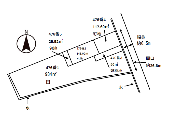 【対象不動産】 ①476番1、田、984㎡②476番2、宅地、148.00㎡③476番3、雑種地、50㎡④476番4、宅地、117.60㎡⑤476番5、宅地、25.92㎡ |