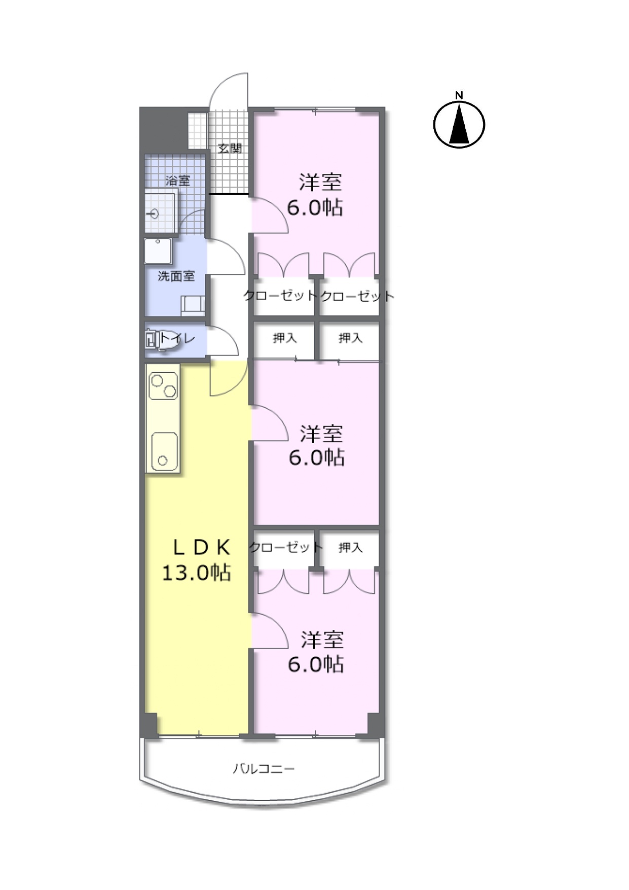 間取り 3LDK( 洋室 6・6・6 帖 / LDK 13 帖 )
