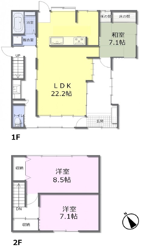間取り 3LDK( 洋室 8.5・7.1 帖 / 和室 7.1 帖 / LDK 22.2 帖 )