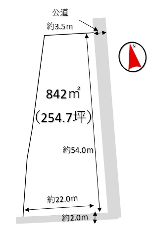 | 接道状況 | [ 東 / 道路幅員 約3.5m 接道幅 公道 約54 m ] [ 南 / 道路幅員 約2m 接道幅 公道 約22 m ] |