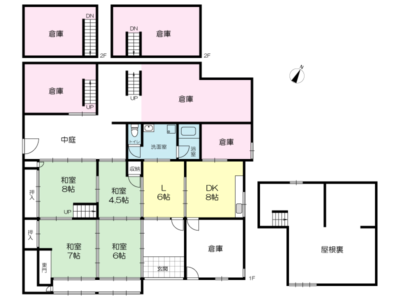 | 間取り | 4LDK( 和室 8・7・6・4.5 帖 / L 6 帖 / DK 8 帖 / 屋根裏収納 帖 ) | ||