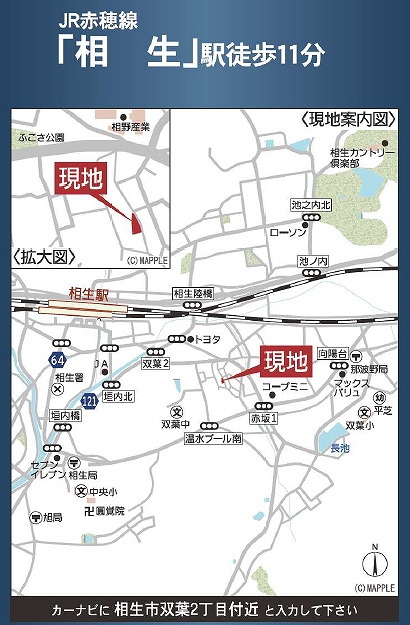 周辺環境 | [ ローソン 相生コスモス店 ( ショッピング施設 ) 270 m ] [ ウエルシア相生赤坂店 ( ショッピング施設 ) 400 m ] [ 相生郵便局 ( 金融機関 ) 1100 m ] [ IHI播磨病院 ( 医療施設 ) 1800 m ] |