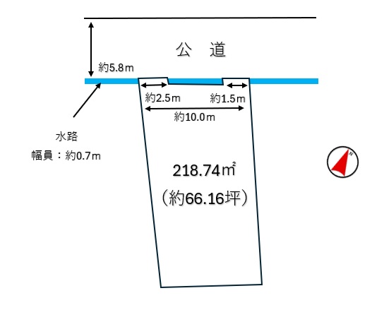 | 接道状況 | [ 北西 / 道路幅員 約5.8m 接道幅 公道 ] |