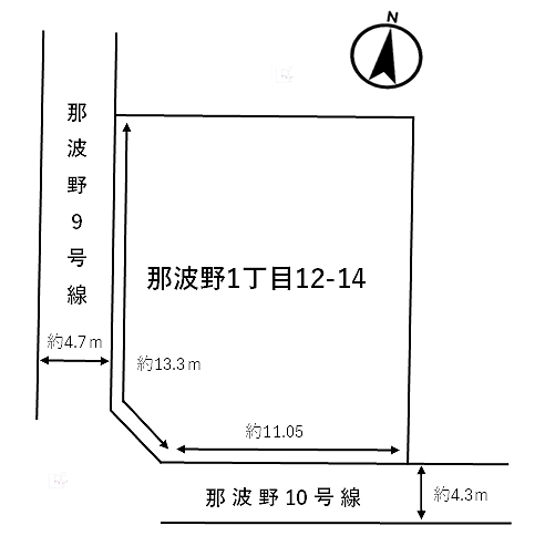 | 接道状況 | [ 西 / 道路幅員 約4.7m 接道幅 公道 約13 m ] [ 南 / 道路幅員 約4.3m 接道幅 公道 約11 m ] |